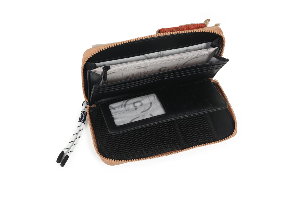 Cuenta con un compartimiento principal de cierre en el que vas a poder organizar tus tarjetas, colocar papeles o billetes y, además, guardar tu celu en su doble bolsillo de red. Por otro lado, al frente te encontrás con otros dos bolsillos externos de monederos.