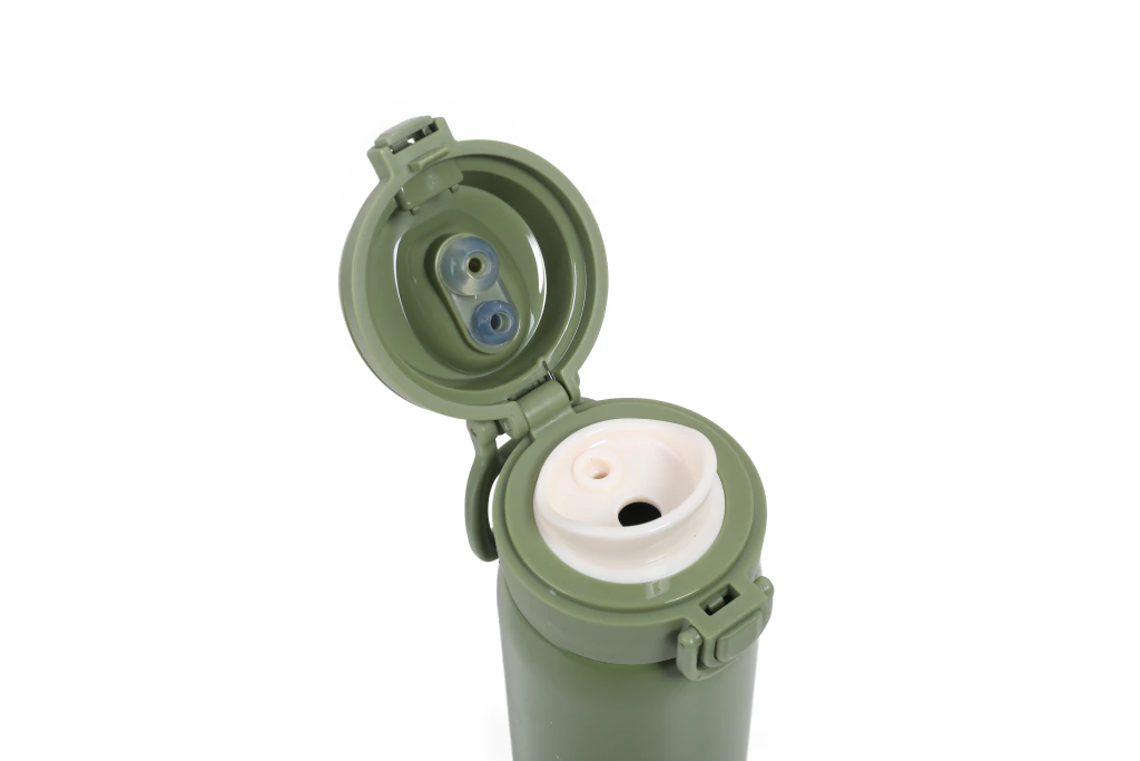 Botella térmica de acero inoxidable con tapa flip y manija. Logo impreso en stamping. Interior: acero inoxidable 304. Manija superior integrada para fácil transporte. Boquilla interior con sistema antiderrame. Mantiene líquidos calientes o fríos por más tiempo (hasta 6-8 hs aprox.). No apta para lavavajillas ni microondas.