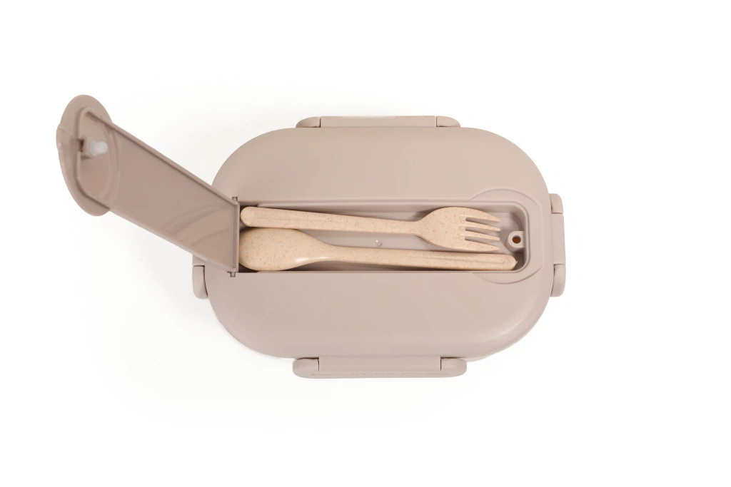Lunchbox con compartimentos internos y cubiertos integrados. Material: plástico PP de alta resistencia, libre de BPA. Incluye cubiertos reutilizables (cuchara y tenedor) con compartimiento superior integrado. Sistema de cierre con 4 trabas laterales herméticas. Apto para microondas (sin tapa). No apto lavavalijjas.