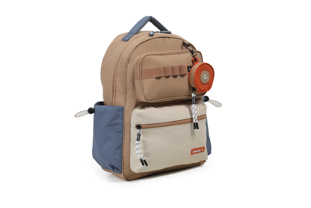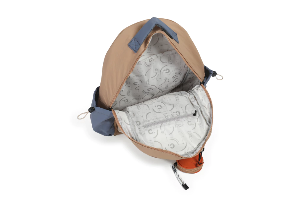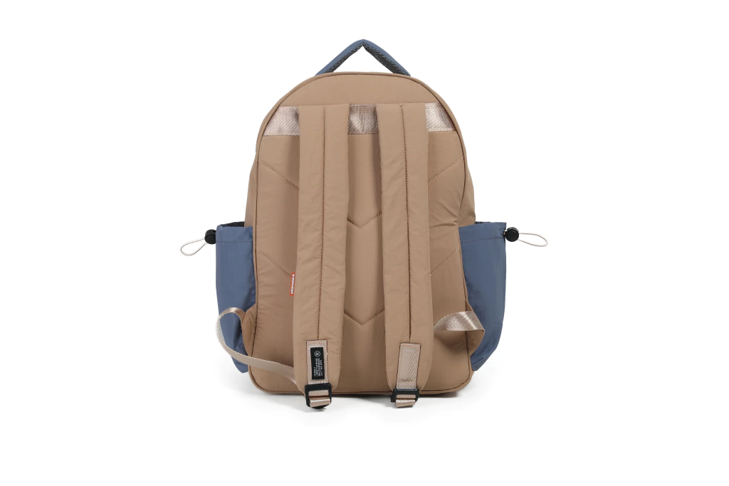 Esta mochila posee un tamaño mediano-grande y está confeccionada en materiales de nylon con diversas texturas. Posee un compartimiento principal y dos bolsillos frontales de cierre. También cuenta con dos bolsillos laterales con elástico para colocar botellas y un pouch extraíble para los auriculares.