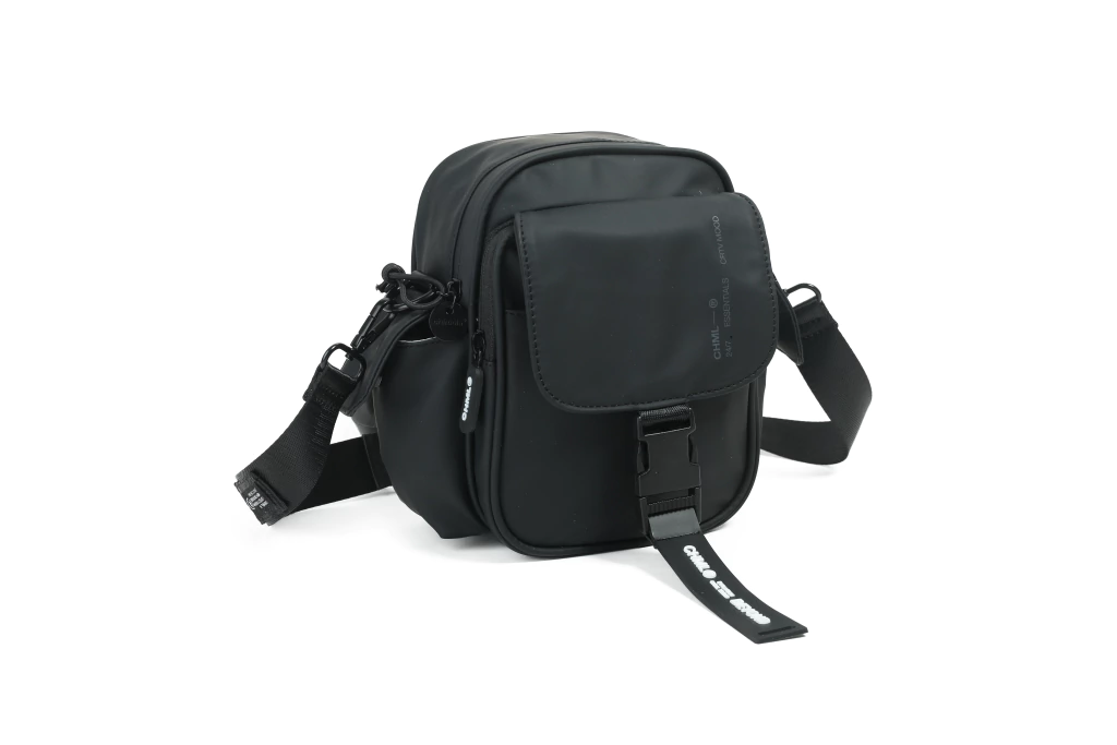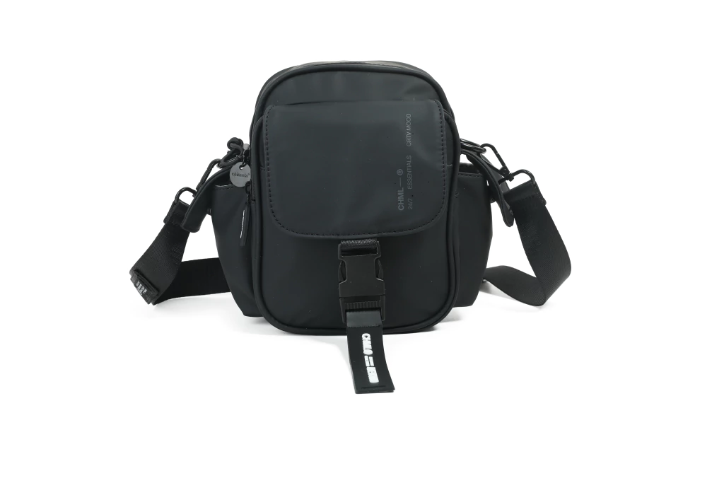 Posee un compartimiento frontal de cierre, dos bolsillos frontales (uno simple debajo de la solapa y otro de cierre) y dos bolsillos laterales pequeños con solapa.